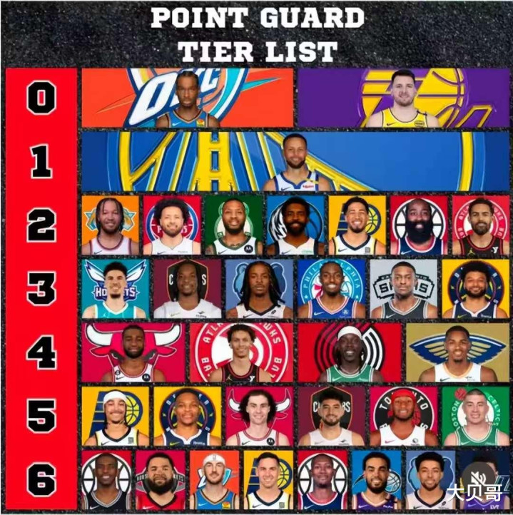 没错第一档上面还有一档,第一档是库里,独一档的存在,虽然进入了生涯末期,但是库里的投射能力依旧是联盟顶级,在季后赛的影响力还是很大,现役联盟前十级别的存在。第0档是亚历山大和东契奇,这两位想必大家都很熟悉,东契奇是现役联盟前五的存在,亚历山大也是,不过亚历山大在上赛季拿下了MVP和FMVP,现在很多媒体认为他已经联盟第一控卫了。