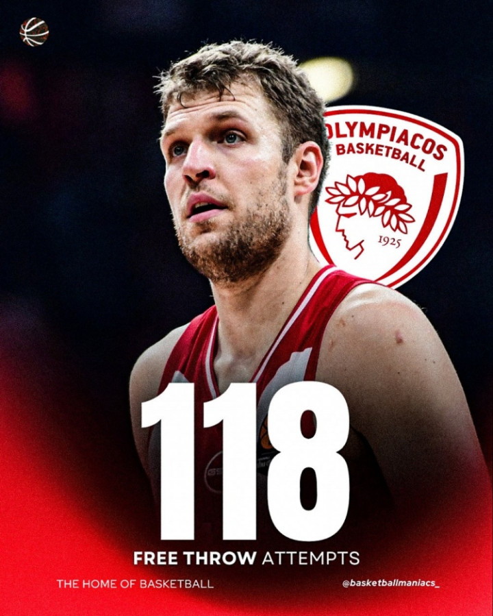 直播吧10月16日讯欧媒BasketballManiacs报道,欧篮联四轮战罢,在球队罚球次数排行上,希腊的奥林匹亚科斯以总罚球数118、场均29.5次排名第一。
