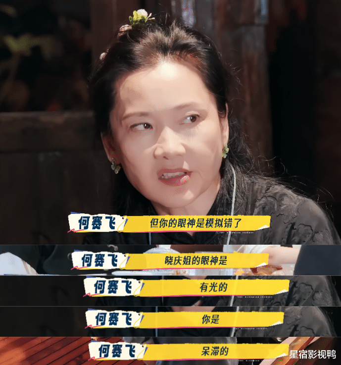而一旁的何赛飞也反驳,柯淳模仿的不对:晓庆姐的眼神是有光的,你是呆滞的。