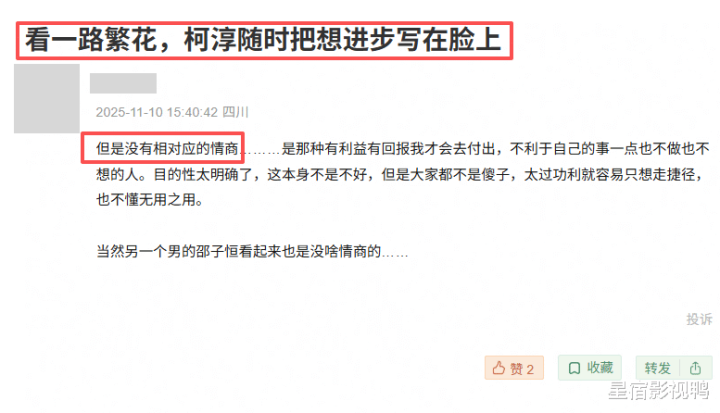 有网友锐评柯淳在节目中的状态:随时把想进步写在脸上,但是没有相对应的情商。