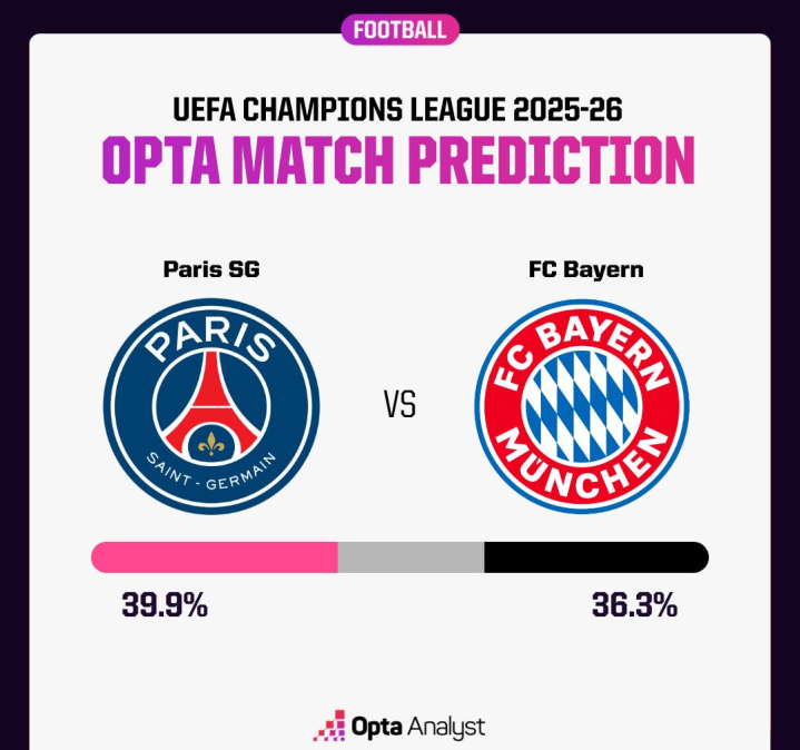 就拿Opta之于本场的预测来看,这无疑既是本赛季欧冠最具关注度的对决,更是一场势均力敌而赛前很难给出预测的巅峰对话--巴黎胜,39.9%;拜仁胜,36.3%;双方平局,23.8%。